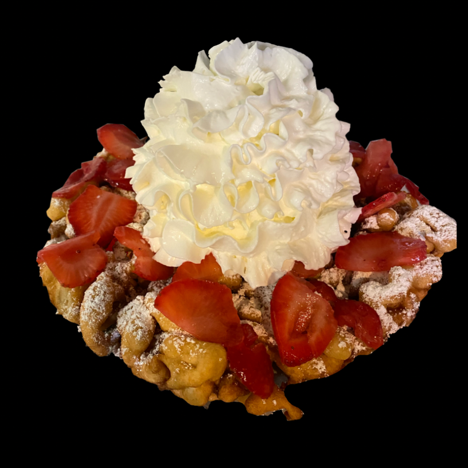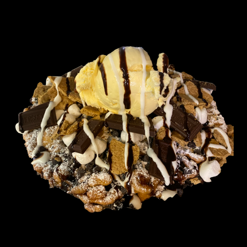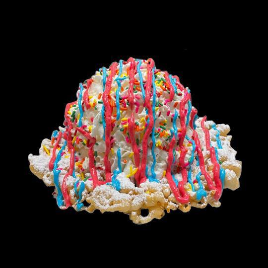 Red Velvet Funnel Cake, Powdered Sugar, Brownie Crumbs, Crushed Oreos, Chocolate Ice Creams, Whipped Cream, & Chocolate Drizzle