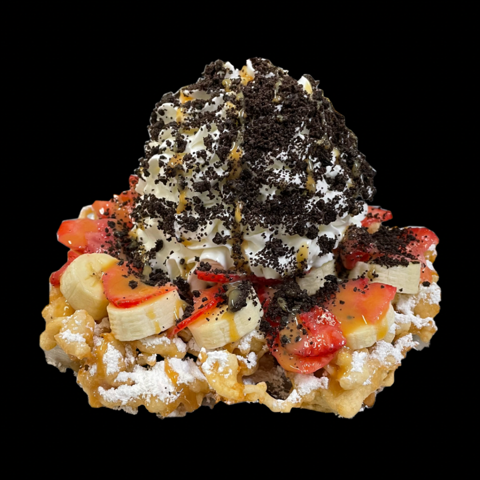 Powdered Sugar, Strawberries, Bananas, Cookies & Cream Ice Cream, Whipped Cream, Crushed Oreos, & Caramel Drizzle