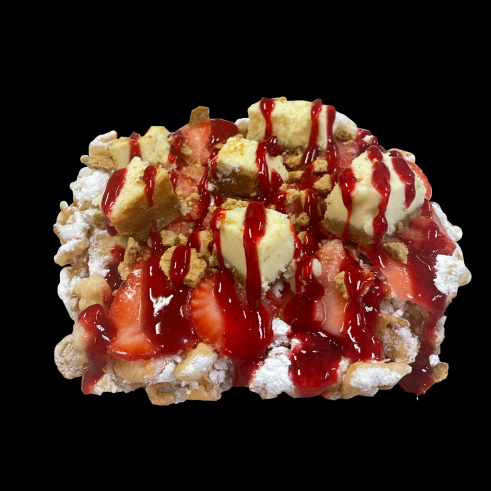 Powdered Sugar, Strawberries, Graham Cracker Crumbs, Cheesecake Bites, & Strawbery Drizzle